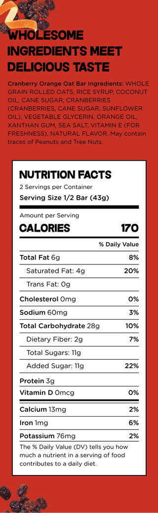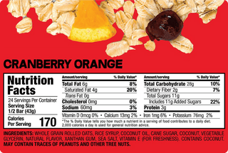 Cranberry Orange Oat Bar Ingredients: WHOLE GRAIN ROLLED OATS, RICE SYRUP, COCONUT OIL, CANE SUGAR, CRANBERRIES (CRANBERRIES, CANE SUGAR, SUNFLOWER OIL), VEGETABLE GLYCERIN, ORANGE OIL, XANTHAN GUM, SEA SALT, VITAMIN E (FOR FRESHNESS), NATURAL FLAVOR. May contain traces of Peanuts and Tree Nuts.
